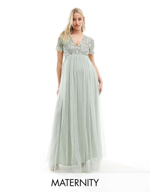 Maya Plus Robe longue de demoiselle d honneur en tulle a epaules denudees et ornements delicats ton sur ton en sequins Blush taupe Very well made.